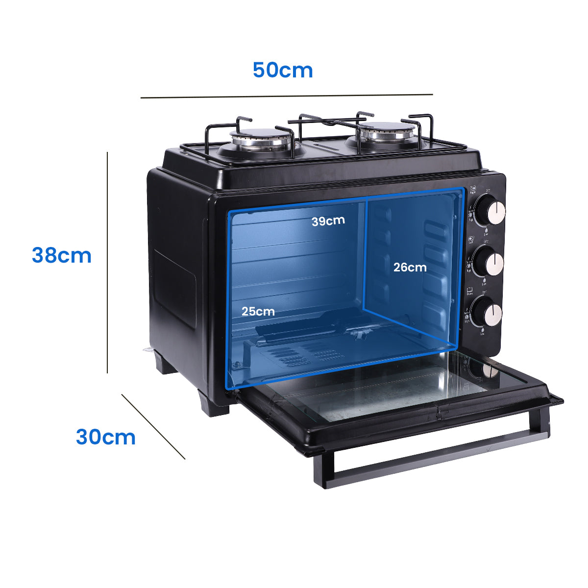 Featuring dual enamelled burners and a gas-powered oven, it provides efficient cooking flexibility, while automatic ignition ensures effortless start-up. Finished in sleek black powder-coated steel with a heat-resistant tempered glass door, this stove seamlessly complements modern kitchen spaces with durability and understated elegance.